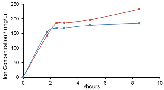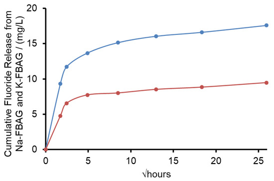 Sodium azide was added as a bactericide to AS7 and potassium phosphate salts were present in the AS7 composition, so the sodium and potassium concentrations released from the glass could not be measured accurately. For this reason, the release of potassium and sodium from both glasses was investigated after immersion in TB at pH 7. The results are shown in Figure 11. The release profiles for potassium from the potassium glass was very similar to that sodium glass. After 9 h of immersion the potassium glass had released 61% of its potassium ions, whilst the sodium glass had released 66% of its sodium ions. Typically, potassium nitrate-based toothpastes contained 3% KNO3 by weight equivalent to 1.16 weight percent potassium. The K-FBAG glass contained just over 25% by weight potassium. If the glass was added to the toothpaste at 5% by weight, the K content would be 1.25% by weight comparable to a potassium nitrate toothpaste. Much like we have salivary fluoride clearance in the mouth for soluble fluoride we are going to get salivary potassium clearance of potassium concentrations above normal salivary levels. The ability of the glass particles to slowly deliver potassium ions is a very attractive feature, particularly if the glass particles can enter the dentinal tubules and the potassium ions released can travel down the tubules to deactivate the nerves in the pulp chamber.