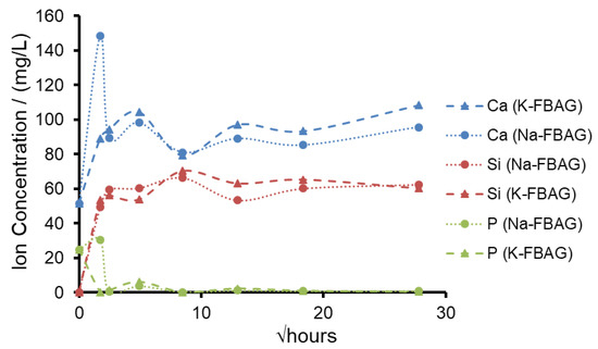 The calcium concentrations in solution were similar for both glasses except at 3 h where there were higher Ca and P concentrations in solution for Na-FBAG compared to K-FBAG, which may be related to the mixed Ca/Na orthophosphate observed in the Na-FBAG glass being more soluble than the Ca orthophosphate in the K-FBAG.