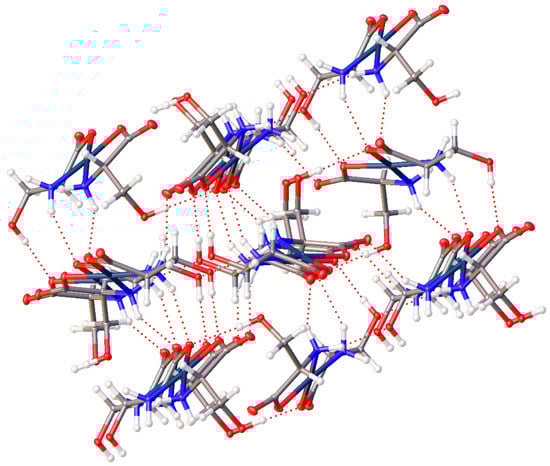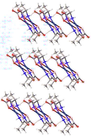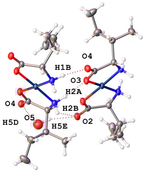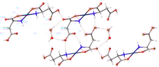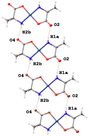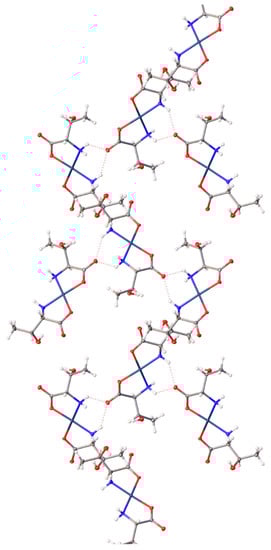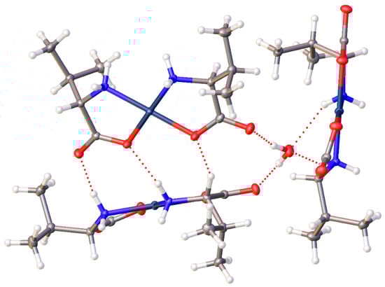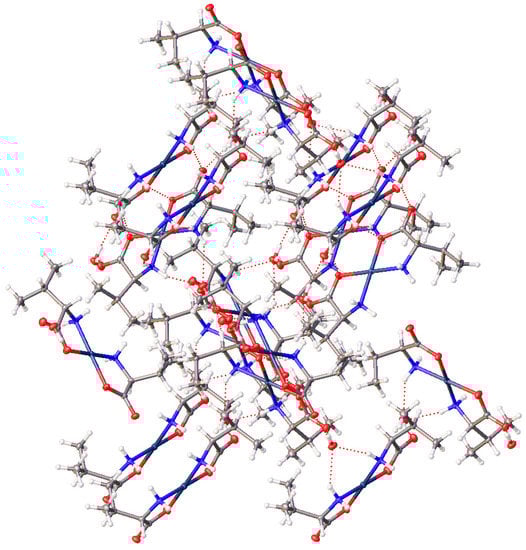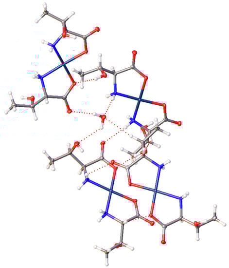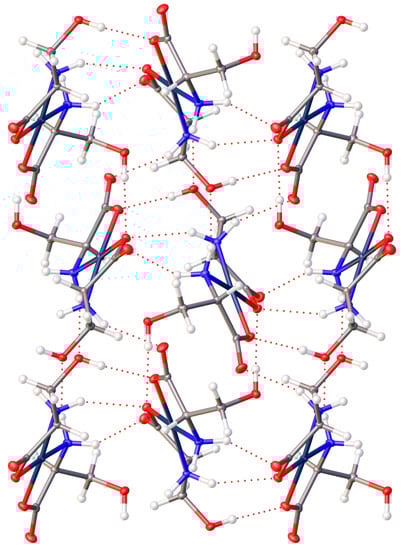 To a large degree, our interest in amino acid complexes of metals stems from their ability to make intricate intermolecular networks due to hydrogen-bonding. The role that H-bonding plays in proteins is enormous and H-bonding in metal complexes of amino acids can also play a huge role in crystal formation and crystal engineering, especially when involving waters of hydration [31,32,33]. Infantes et al. examined the crystal literature and described various motifs they found [34,35]. The number of possible hydrogen bonding motifs is quite large and Infantes et al. have proposed a system to describe these complex motifs. Developing a deeper understanding of H-bonding in organic and organometallic systems is a complex and ongoing field of study [31,32,36,37,38].