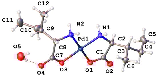 Thermal ellipsoid plot of cis-bis-(valinato)palladium(II) (2). Thermal ellipsoids are shown at the 50% probability level. CCDC Ref number: 2055914.