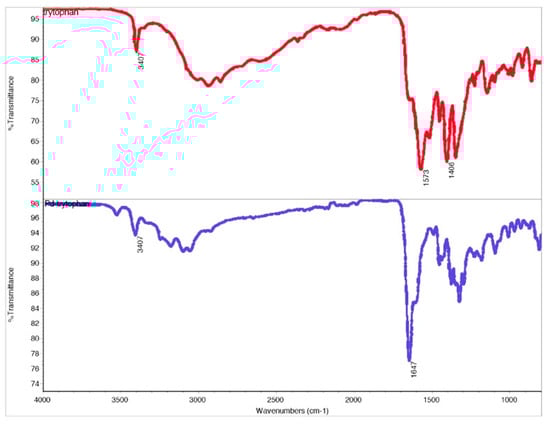 Solid-state FTIR spectral comparison of tryptophan free ligand (top, in red) and the bis-(tryptophanato)palladium(II) complex (7) (bottom, in blue).