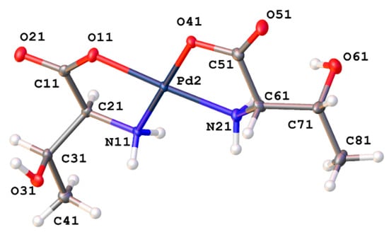 X-ray crystal structure of cis-bis-(threoninato)palladium(II) (16). Thermal ellipsoids are shown at the 50% probability level. CCDC Ref number: 2055913.