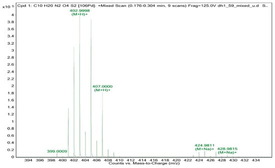 High-resolution TOF mass spectrum of bis-(methioninato)palladium(II) (14).