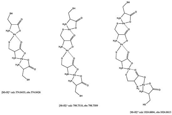 Battaglia et al. described the crystal structure of S-methyl cysteine palladium dichloride with N,S coordination, and a free carboxylic acid side chain [27]. In our hands, the reaction of cysteine with palladium(II) acetate to yield bis-(cysteinato)palladium(II) (12) also failed to yield an isolatable product, however, the HRMS data from the reaction mixture show a series of products whose masses correspond exactly to discreet ratios of ligand and metal. In these proposed structures (Figure 17) each palladium center is N,O chelated by the ligand, with the thiol group and the non-coordinated carboxylate carbonyl oxygen coordinated to another palladium center.