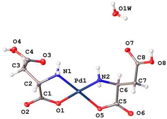 ORTEP plot of the crystal structure of cis-bis-((η2-N,O)-aspartate)palladium(II) (17). CCDC Ref number: 2055912.