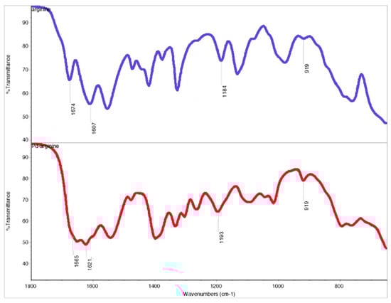 Solid-state FTIR spectral comparison of the free arginine ligand (top, in blue) and bis-(argininato)palladium(II) (20) (bottom, in red) showing the presence of characteristic guanidine C-N stretching vibrations in both molecules.