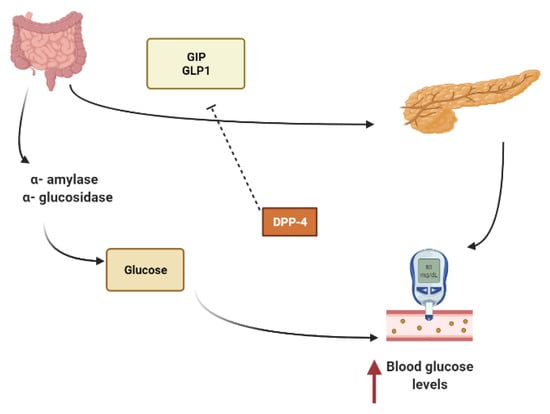 Other secondary metabolites can modulate the secretion of glucagon-like peptide-1 (GLP1), inhibiting dipeptidyl peptidase-4 (DPP4) from extending the effect of GLP1. In L-cells of the small intestine, basal serum GLP1 is released in response to nutrients loads (Figure 1). It promotes insulin secretion and stimulates the hypothalamus gland to induce postprandial satiety and to inhibit glucagon secretion. GLP1 has a very short half-life because it is hydrolyzed by dipeptidyl peptidase-4 (DPP4) [,,].