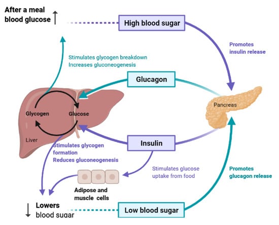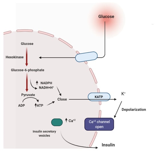 To maintain constant blood glucose levels, various body organs, including the pancreas, liver, intestine, adipose and muscle tissues with various hormones and neuropeptides, work together. The pancreas plays a crucial role in glucose homeostasis by secreting insulin and its opponent glucagon []. The increased circulating glucose is sensed by pancreatic β-cells and subsequently glucose influx into the cells via GLUT2, an insulin-independent transporter (Figure 2). Glucose induces insulin secretion from β-cells via the closure of ATP-gated potassium channels and activation of voltage-gated calcium channels [,,,].