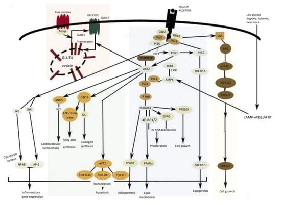 Insulin modulates several metabolic pathways through a cascade of signal transduction steps initiated when the insulin binds to the insulin receptor (IR), stimulating a receptor’s intrinsic kinase activity []. Insulin receptor substrates IRS1 and IRS2 are phosphorylated by several kinases such as ERK (extracellular signal-regulated kinases), JNK (c-Jun N-terminal kinase), and AMPK (AMP-activated protein kinase). Consequently, insulin substrates activate a number of kinases, including PI3K (PI3K: phosphoinositide 3-kinase)/Akt pathway as well as the MAPK (MAPK: mitogen-activated protein kinase) pathway [,].
