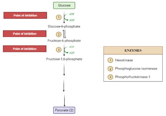 The liver is the chief organ in maintaining glucose homeostasis through controlling various pathways, including glycogenesis, glycogenolysis, glycolysis and gluconeogenesis []. During feeding conditions, glucose is a primary fuel source across multiple fuel sources across numerous body tissues by eliciting ATP molecules during hydrolysis and the Krebs cycle. The increase in glucose uptake in hepatocytes promotes glycolysis and lipogenesis to generate triglycerides as storage forms of fuel [,]. Glycolysis can be regulated through the reactions catalyzed by hexokinase, phosphofructokinase, and pyruvate kinase (Figure 5 and Figure 6). Moreover, there are seven enzymes involved in this Krebs cycle, of which only two enzymes, succinate dehydrogenase and malate synthase, can be regulated. Several plant secondary metabolites (discussed below) can regulate and affect these enzymes except for the pyruvate kinase enzyme [,,].