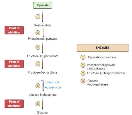 During the fasting state, the liver is the leading factory for glucose production through gluconeogenesis and glycogenolysis. The main regulatory enzymes in the gluconeogenesis pathway include glucose 6-phosphatase (G6Pase), fructose 1, 6-bisphosphatase (Fbpase1), PC (pyruvate carboxylase), and phosphoenolpyruvate carboxykinase (PEPCK), all can be inhibited by plant secondary metabolites (Figure 7) [,].