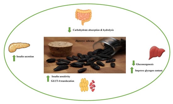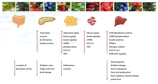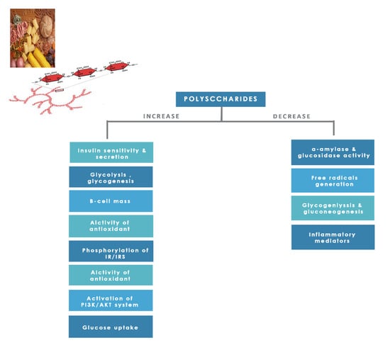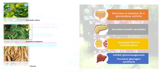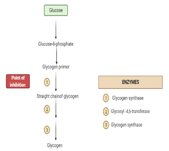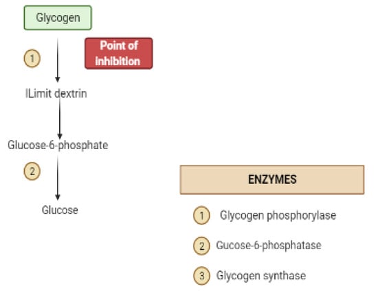 Glycogen synthesis from unused glucose is a multistep process carried out by the enzyme glycogen synthase in the liver. Secondary metabolites can affect the process through glycogen synthase. In addition, glycogenolysis is inhibited through glycogen phosphorylase (Figure 8) [].