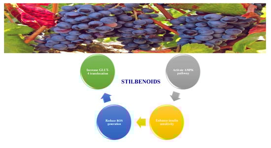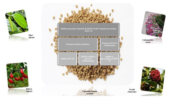 Oxidative stress has been linked to diabetes. It comprises insulin secretion and insulin action. It activates NF-κB and JNK, IRS degradation, suppresses GLUT-4 expression and translocation, activates inflammatory responses [,]. Plant secondary metabolites can stimulate mitochondrial metabolism and/or decrease mitochondrial dysfunction through targeting sirtuin 1 activators (SIRT1) and PPAR α [].