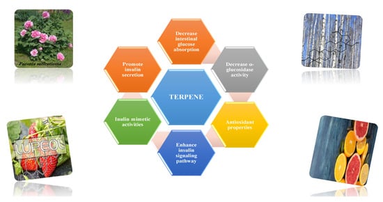 - Panigrahy, S.K.; Bhatt, R.; Kumar, A. Targeting type II diabetes with plant terpenes: The new and promising antidiabetic therapeutics. Biologia 2021, 76, 241–254. [Google Scholar] [CrossRef]