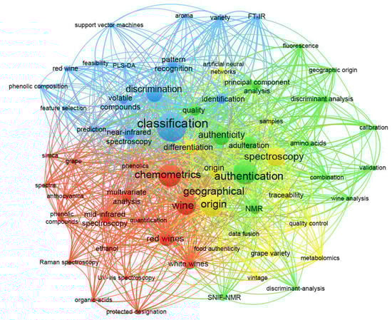 Classical techniques such as gas chromatography-mass spectrometry and high-performance liquid chromatography are advancing continuously, facilitating wine analysis with high sensitivity [5]. Considering the applicability in an industrial setting, however, aspects such as rapidity, user-friendliness, and cost-effectiveness have become of paramount importance in recent times [6]. Spectroscopic techniques provide a great solution due to their relative simplicity, speed of analysis, simple sample preparation, and environmental friendliness [7], and have been well-utilised for different wine and grape research studies, such as for targeted and non-targeted chemical analyses [8], prediction of sensory attributes [9], and wine authentication [10,11]. A snapshot of selected research outcomes identified from the Web of Science Core Collection over the past three decades using ‘wine authentication’ and ‘spectroscopy’ as the search keywords is visualised in Figure 1 to provide some understanding of the trends in the literature. Aside from those specific keywords, the terms classification, chemometrics, and geographical origin also feature prominently and are variously linked upon closer inspection to a range of terms associated with spectroscopic (e.g., near-infrared, mid-infrared, NMR, UV–visible, Raman, fluorescence) and chemometric (e.g., partial least squares discriminant analysis, feature selection, support vector machines, artificial neural networks, principal component analysis, discriminant analysis, data fusion, pattern recognition) techniques.