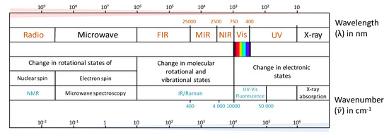 The electromagnetic spectrum and its relevance to different spectroscopic methods. FIR, far-infrared; MIR, mid-infrared; NIR, near-infrared; Vis, visible; UV, ultraviolet. Techniques in this review that are applied for wine authentication are indicated in light blue font. Conceptualised from [15].