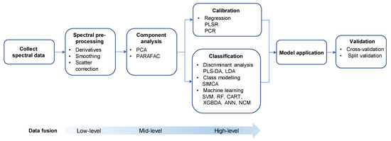 Schematic of the steps involved with chemometric analysis of spectroscopic data. Stages where data fusion can be applied depending on the extent of processing are also presented in the diagram.