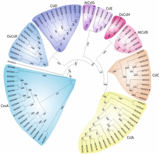 Circular phylogenetic tree of Arabidopsis (At) and rice (Os) CesA and Csl proteins. The neighbor-joining (NJ) tree was constructed using ClustalX2 and displayed by iTOL: https://itol.embl.de/ (accessed on 5 May 2021). The bootstrap values of the analysis based on 1000 replicates are presented. The asterisks (*) indicate the proteins used for 3D modeling. The accession numbers of Arabidopsis and rice CesA and Csl proteins are reported in Table S1.