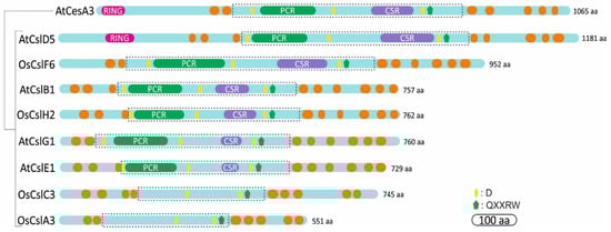Domain structures of representative members of Arabidopsis (At) or rice (Os) CesA and Csl classes. The transmembrane (TM) helices are shown as orange rectangles. The N terminal region of CesA and CslD contains a RING type zinc finger domain. The plant-conserved region (PCR) and the class-specific region (CSR) are absent from CslA and CslC classes. The hydrophilic catalytic domain is boxed in a dotted line rectangle. The transmembrane regions were predicted using the PredictProtein server: https://predictprotein.org/ (accessed on 5 May 2021). The coordinates of PCR and CSR were estimated through protein alignment between the CesA and Csl members as previously described [46].