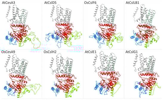 Given that data regarding the structure of Csl proteins are not available as yet, compared to the pile of mostly recent information regarding the architecture of CesA, a comparative analysis was performed to identify the features of the Csl catalytic domain. To accomplish this task, the protein structure homology-modeling server SWISS-MODEL was used to search first for evolutionary related structures with BLAST and HHblits [50]. Representative members of Arabidopsis and rice CesA and Csl classes were selected (Figure 3 and Figure 4). As expected, the primary and secondary cell wall CesA proteins matched the target sequence of the recently analyzed poplar CesA8 [38]. Notably, members of CslB, CslD, CslE, CslF, CslG and CslH classes that share a relatively high degree of amino acid similarity with CesA, especially at the catalytic domain, also resulted in a match with poplar CesA8 (Figure 3 and Table S3). Strikingly, prediction analysis showed that 3D models of CslB/D/E/F/G/H display structural congruence, having analogous properties with the experimental elucidation of plant CesA structure [38,48] (Figure 3). In particular, both CesA and Csl formed a channel of transmembrane helices. The catalytic core of the glyosyltransferase (GT) domain faced the entrance of the transmembrane channel and the PCR domain located at the periphery of the GT domain. PCR and CSR domains were connected at the catalytic domain via long flexible loops projecting from both sides of the catalytic domain at a distance from the channel of TM helices. CSR seemed to be intrinsically disordered and flexible due to the high variability between the protein members.