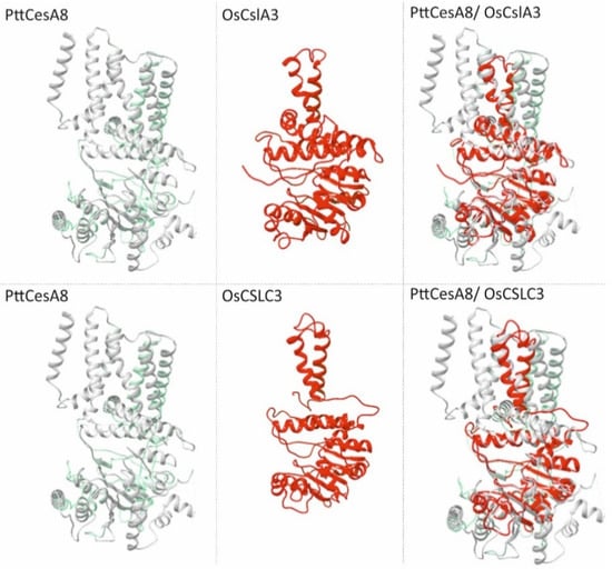 The results of the predicted 3D model analysis were consistent with the experimental data of cellulose synthase complex structure [38,48], supporting the accuracy of the analysis. The 3D model prediction confirmed that in terms of structure, the catalytic domain between the CslA and CslC classes was highly similar, in agreement with the Csl classification which showed a close relation between these classes (Figure 1 and Figure 4). However, it was really surprising that the evolutionary distant members of CslA and CslC classes, which in terms of the primary structure shared a low-level similarity with CesA (Figure 1 and Table S3), matched perfectly with the core catalytic domain and two transmembrane helices of poplar CesA8 (Figure 4). This structural similarity supports the notion that even though CslA and CslC emanate from a common ancestral bacterial cellulose synthase counterpart [41], they probably represent primitive forms of CesA proteins.
