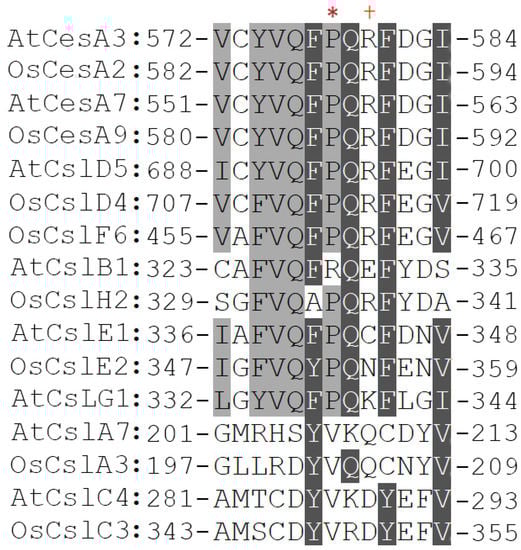 Multiple sequence alignment of CesA and Csl representative members reveals high evolutionary conservation of a set of amino acid residues within the catalytic domain. Among these residues, proline-578 of Arabidopsis CesA3 presented with an asterisk (*) was included known to generate semi dominant mutants. The cross (+) marks the arginine residue at position 588 of OsCesA9, which is substituted to glycine in rice bc6 semi dominant mutant.