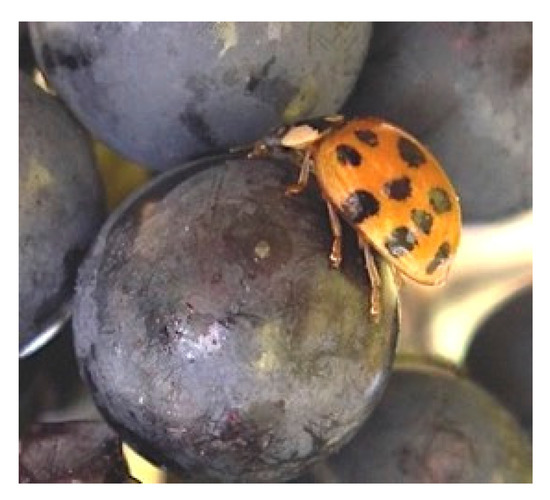 Ladybug taint (LBT, also known as ladybird taint) was first associated with the presence of large numbers of Harmonia axyridis (Pallas) (Coleoptera: Coccinellidae) beetles in vineyards at harvest, and corresponding off-odors in the subsequent wines. H. axyridis, more colloquially known as the multicolored Asian ladybeetle (MALB), originates in northeastern Asia, and was first introduced to North America in 1916 as a form of biocontrol against aphids and some small, soft-bodied pests [1,2]. It was introduced to France in 1982 [3], while in Canada it was first reported in southern Québec between 1992 and 1994 [4]. When introduced, the beetle typically extends its range into non-target regions and crops, including grape vineyards, and is now present in many winegrowing countries and regions around the globe. In the vineyard, MALB adults aggregate on grape clusters during autumn, and are often picked with the grapes and transported into the winery [5] (Figure 1). Their presence during crushing and winemaking operations can lead to unpleasant aromas and flavors in the subsequent wine, known collectively as LBT [6,7,8].