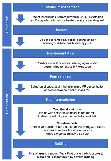 In considering interventions for musts/wines affected by Coccinellidae, the winemaker should also be cognizant of minimizing the contribution from the endogenous MP load of the grapes, especially in high-MP varieties such as Cabernet Sauvignon, Cabernet Franc, and Carmenère, or when the grapes have not reached full flavor maturity (Section 1.1). This includes de-stemming, as over half of grape-derived MPs come from the stems [24,49], and consideration of maceration time, with most MP extraction occurring during the first 24 h [50,51].