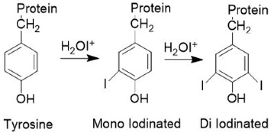 Iodination tubes, the most popular and convenient, are used routinely in research laboratories. Iodogen in the iodination tube, like Chloramine T, converts I− to I+ (H2OI+) or ICl followed by an electrophilic substitution reaction on the aromatic moiety in peptides and proteins (Figure 1), forming mono- and di-iodinated tyrosyl residues [30].