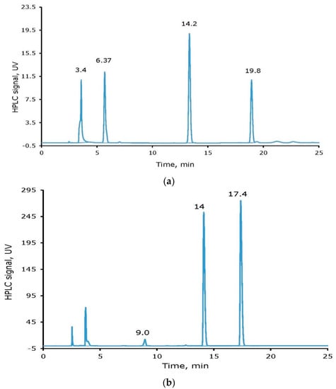 HPLC chromatograms of the reaction mixtures of non-radioactive iodine labeling of tyrosine (a) and cyclo Arg-Gly-Asp-d-Tyr-Lys (cRGDyK) (b).