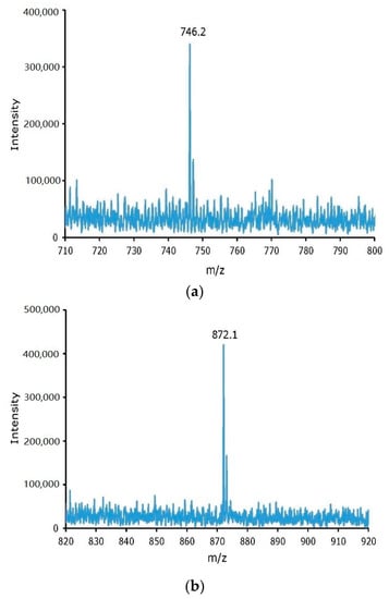 The crude non-radioactive iodine labeling reaction mixtures of tyrosine and cRGDyK were purified by an RP Sep-Pak cartridge method, to remove unreacted iodide, and RP-HPLC purification method, to remove unreacted tyrosine or cRGDyK. The two RP-HPLC peaks, at 14.2 and 19.8 min retention times from the non-radioactive iodine labeling of tyrosine, were collected, concentrated, and confirmed by Electrospray Ionization (ESI) mass spectra as mono- and di-iodinated tyrosine with m/e peaks, for (m + H)+, at 306.8 (calculated 307.09) and 433.8 (calculated 433.9), respectively. Similarly, the identity of I- cRGDyK and I2- cRGDyK was confirmed by ESI mass spectra after collecting the 14 and 17.4 min peaks from the non-radioactive iodine labeling reaction mixture of cRGDyK. The m/e peaks, for (m + H)+, were observed as 746.2 (calculated 746.68) and 872.1 (calculated (872.58) for I- cRGDyK and I2- cRGDyK, respectively. As shown in Figure 3, the ESI mass spectrum did not show any evidence of the formation of the N-chloro derivative of cRGDyK. On the contrary, non-radioactive iodine labeling of cRGDyK using the Iodogen method showed evidence of N-chlorination of the lysine residue in the cyclic peptide [13].