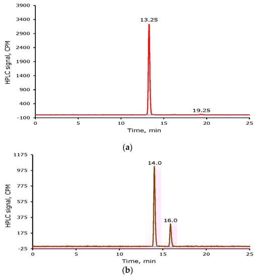 HPLC Chromatogram of radioiodine labeled tyrosine (a) and cyclo Arg-Gly-Asp-d-Tyr-Lys (cRGDyK) (b) after Sep-Pak purification.