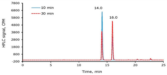To optimize the reaction time for radioiodine labeling of tyrosine and cRGDyK, a mixture of 0.16 µmole of cRGDyK, 356 µCi 125I, and 0.22 µmole of NH2Cl were reacted. An aliquot of the reaction mixture was analyzed at 10 min and 30 min after quenching the reaction. From the time-dependent radioiodine incorporation into cRGDyK, it was concluded that 10 min of incubation of the reaction mixture is sufficient for the completion of radioiodine labeling of the tyrosine residue in cRGDyK. Longer period incubation converted mono-iodinated cRGDyK to an increased percentage of di-iodinated species. For example, the ratios of 125I-cRGDyK:125I2-cRGDyK were observed as ~67:33 and ~42:58 after 10 and 30 min incubation, respectively (Figure 5). The amount of 125I2-cRGDyk at 30 min in this study is higher than the study above, possibly due to the higher amount of 125I (giving higher 125I radioactivity/mass ratio) used in this study.