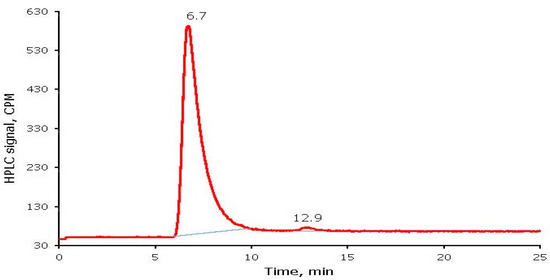 For a representative radioiodine-labeled BSA sample, top and bottom halves had 4.58 and 212.2 kCPM, respectively. The RCP and free radioiodide of radioiodine labeled BSA were calculated from the Paper Chromatography method as 97.9% and 2.1%, respectively. An SEC-HPLC chromatogram for the same radioiodine labeled BSA sample is shown in Figure 6. Radioiodine labeled BSA and free radioiodide eluted at 6.7 and 12.9 min, respectively. Consistent with the Paper Chromatography results, the SEC-HPLC showed RCP of radioiodine labeled BSA as 98.7% with free radioiodide as 1.3%.