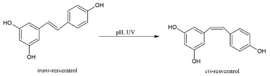 One of the plant polyphenols more often studied is resveratrol. Resveratrol (3,5,4’-trihydroxy-trans-stilbene) is a representative of stilbenes, which are small-molecule compounds containing two aromatic rings in their structure. Resveratrol was first isolated in 1940 from the roots of white hellebore (Veratrum grandiflorum) [15]. Depending on the attachment position of individual functional groups and their mutual position in relation to each other and in relation to the double bond, these compounds exist in two stereoisomeric forms: cis-resveratrol and trans-resveratrol (Figure 1) [22]. Resveratrol is found in both isomeric forms. However, the steric point of view, the trans isomer is more stable than the cis isomer. In addition, the trans-resveratrol form is better researched and shows greater activity compared with the cis form. Moreover, trans-resveratrol is more biologically active, for example, in its antioxidant and anticancer properties [23,24,25]. The cis and trans isomers coexist in plants and wine. However, the cis-resveratrol isomer has never been found in grape extract [26]. The cis form is formed by isomerization through the action of UV radiation, artificial light, high pH on the trans form or during the fermentation of grape skins (Figure 2) [27,28].