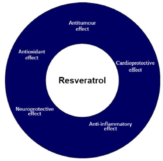 Resveratrol is a phytoalexin, a compound produced by plants in response to the attack of pathogens and as a result of UV radiation and the action of heavy metals [33,34]. For this reason this compound exhibits several diverse biological activities (Figure 3) [35]. In France, despite limited physical activity, high consumption of animal fats and substantial consumption of red wine, a low mortality rate from cardiovascular disease is observed. This phenomenon is known as the French paradox. The association of the presence of resveratrol in red wine with its cardioprotective effect resulted in a great interest in this compound [36]. The anti-inflammatory effect of resveratrol is due to its ability to inhibit the synthesis and secretion of inflammatory mediators [37]. Resveratrol also has a neuroprotective effect on the brain. These properties are used in the treatment of many neurodegenerative diseases, such as Alzheimer’s disease or Parkinson’s disease [38]. The antioxidant effect of resveratrol is related to the inhibition of the formation of free radicals and the removal of those already formed from the body [39]. In our review, we focus on the antitumour activity of resveratrol.