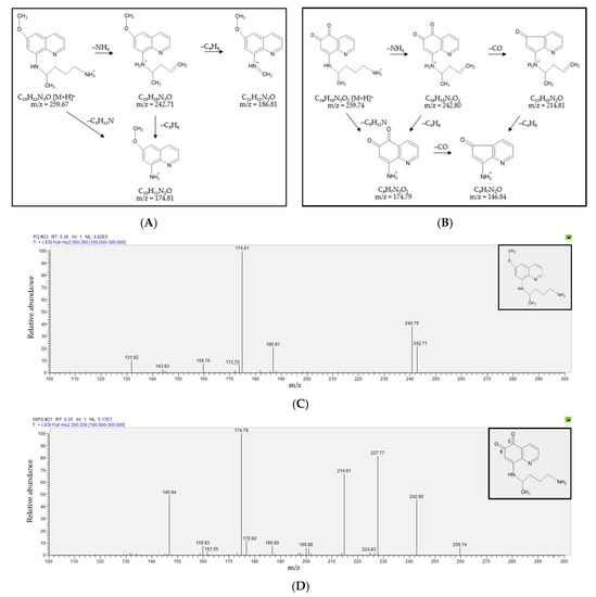 The fragmentation patterns and the MS/MS spectra of primaquine (PQ) and 5,6-orthoquinone primaquine (5,6-PQ). The fragmentation patterns of (A) PQ; and (B) 5,6-PQ. The MS/MS spectra of (C) PQ showed the key fragments at m/z 242.71 (−17; –NH3), 186.81 (−73; –C4H11N), and 174.81 (−85; –C5H11N); and (D) 5,6-PQ showed the key fragments at m/z 242.80 (−17; –NH3), 214.81 (−45; –CH3ON), 174.79 (−85; –C5H11N), and 146.84 (−113; –C6H11NO).