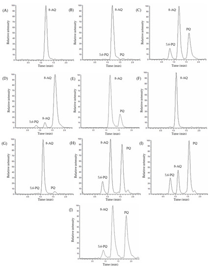 The retention times of 5,6-PQ, 8-AQ, and PQ in plasma and urine were 0.8, 1.2, and 1.6 min, respectively. Representative chromatograms for each analyte in human plasma and urine are shown in Figure 2.