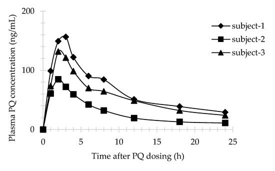 PQ in human plasma (n = 3); Subject-1, 44 years old (diamond line); Subject-2, 55 years old (square line); Subject-3, 49 years old (triangle line).