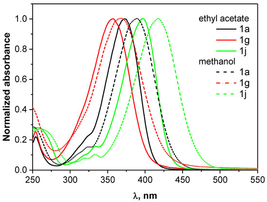 Since the compounds can be used for the preparation of different groups of dyes, their basic spectroscopic data are compiled in Table 1. They are determined in two solvents of varying properties, i.e., methanol and ethyl acetate. The normalized electronic absorption spectra of selected p-aminocinnamic aldehydes (1a, 1g and 1j) in ethyl acetate (EtOAc) and methanol (MeOH) are shown in Figure 2, whereas the spectra for all synthesized compounds are presented in the ESI file.