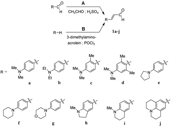 p-Aminocinnamic aldehydes were prepared from the reaction of either acetaldehyde with aromatic aldehydes bearing appropriate substituents (Method A) or aromatic amine and 3-dimethylaminoacrolein in the presence of POCl3 (Method B). The desired products were obtained at a low to moderate yield with slightly higher values of ca. 6–16% achieved using Method B. The yields of the reactions carried out according to method A are 32–54%, while for Method B, they are in the range of 36–61%. In addition to the better yield, an important advantage of Method B is the use of relatively readily available aromatic amines instead of the often difficult to obtain benzaldehydes. Moreover, the 4-(N,N-dimethylamino)-2,6-dimethylcinnamaldehyde (1d), probably due to spatial hindrance, could only be synthesized by Method B. It should also be noted that six of the synthesized aldehydes (1c, 1d, 1e, 1f, 1h, 1i) have not been described in the literature so far.