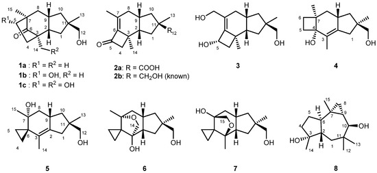 These molecules belong to the cyclohumulanoid family, and except for 8, contain a C-1/C-2/C-9/C-10/C-11 cyclopentane ring sharing methyl (C-13) and hydroxymethyl (C-12) groups at C-11 with (R)-configuration, although the absolute configurations of 6 and 7 were not unequivocally established. A protoilludane derivative 10 can be envisaged as the key biosynthetic intermediate for the compounds obtained in the present study. Protoilludane 10 is likely derived from farnesyl pyrophosphate via humulenyl cation 9 as shown in Scheme 1. According to the established configurations, the oxidation of C-12 occurs stereoselectively right after cyclization because all compounds except for 8 contain an (11R)-hydroxymethyl group. Humulenyl cation 9 also produces 8 in another tandem cyclization at C-7/C-9 and C-2/C-6; however, a different type of enzyme may be responsible for this process [8,10]. Protoilludanes 2a, 2b, and 3 are obtained by oxidation(s) of 10. Epoxide 11 can be proposed as a versatile intermediate yielding cerapicanes 1a–c, sterpurane 4, and illudanes 5–7. An epoxide ring opening reaction at C-6 induces a ring contraction of cyclobutene into a cyclopropane, affording illudanes 5–7. Another epoxide ring opening at C-7 promotes a ring expansion into cyclopentane, generating cerapicanium cation 12. Deprotonation at 5-OH affords ceapicanes 1a–1c, whereas another deprotonation at H-2 produces a concerted olefin formation and ring contraction into cyclobutane to give tricosterpurol (4).
