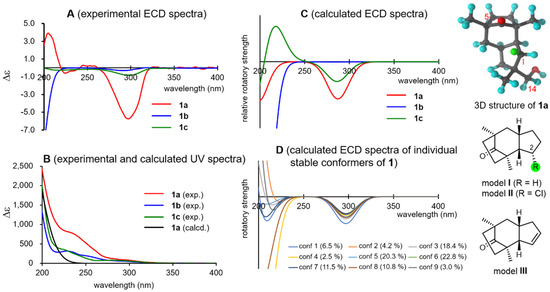 Experimental UV/ECD spectra of 1a, 1b, and 1c (spectra A and B), calculated ECD spectra (spectra C), calculated ECD spectra of the individual conformers of 1a (spectra D), three-dimensional structure of 1a, and structures of models I–III.