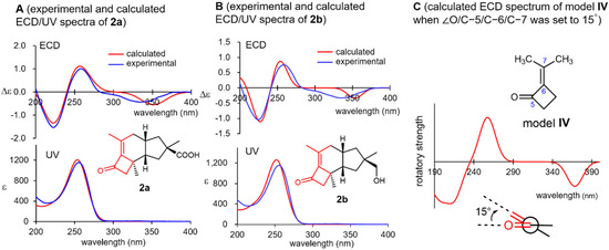 Experimental and calculated ultraviolet/electronic circular dichroism (ECD) spectra of 2a (spectra A) and 2b (spectra B) and virtual ECD spectrum of model IV by setting the torsion O/C-5/C-6/C-7 to 15° (spectrum C).