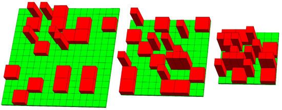 is a fixed constant, given that no molecules are added or removed from the monolayer. Note that can also be interpreted as the fraction of lattice sites occupied by the molecules, given they would all reside in their vertical orientation; hence, . The lattice model is illustrated in Figure 2 for the example .