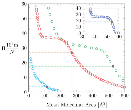 The first example is represented by the red circles in Figure 5 and is adopted from Miñones et al. [21], who investigated monolayers of the cyclic oligopeptide cyclosporin A at the air–water interface. The isotherm was recorded at high ionic strength (3 M NaCl) and was interpreted by the authors in terms of two orientations that cyclosporin A adopts, one in which the ring of the molecule lies horizontally on the surface and another where the ring is shifted to a vertical orientation. A collapse area , a point of inflection at a mean molecular area , and a corresponding lateral pressure mN/m can be identified by visual inspection. The point of inflection is highlighted in Figure 5 by a filled black circle. We obtain and . (Recall that because of the scaling by the thermal energy unit this actually means .) We now solve Equation (27) for , yielding