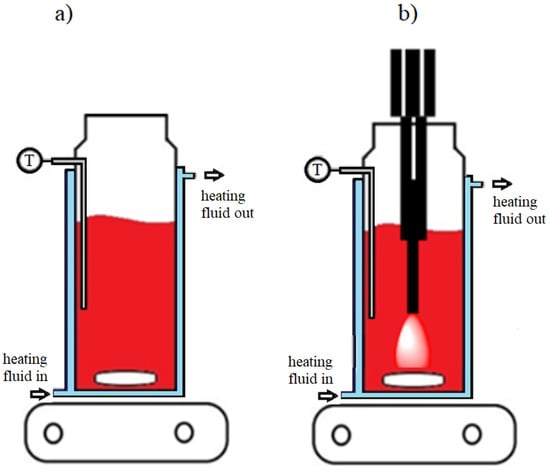 Figure 1b shows the arrangements for the ultrasound-assisted extractions. UAE was performed using the probe systems (Vibracell 750VCX (Sonics & Materials Inc., Newtown, CT, USA)—with a tip diameter of 13 mm), and the energy delivered by the probe system was calorimetrically determined [27,28]. The ultrasonic device was operated in pulse mode (5 s on and 5 s off) to control the reaction temperature and reduce oxidative degradation of the carotenoids [29]. The powers determined for the ultrasonic input are shown in Table 2.