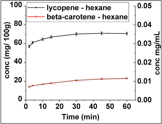 Change in lycopene and beta-carotene concentration (mg carotenoid/100 g dry plant (left y-axis) and mg carotenoid/mL solvent (right y-axis)) during extraction from Pontica 102 skins with hexane, under conventional conditions at 60 °C.