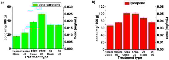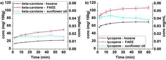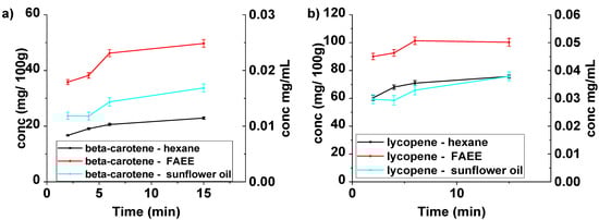 Changes in the yields of beta-carotene and lycopene induced by UAE are represented differently in Figure 6. Here it can be seen that for both materials FAEE is the best solvent although in the case of lycopene the yield is not improved using UAE but is reached in a significantly shorter time (6 min).