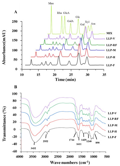 HPLC profiles of constituent monosaccharides (A) and FT-IR spectra (B) of LLPs.